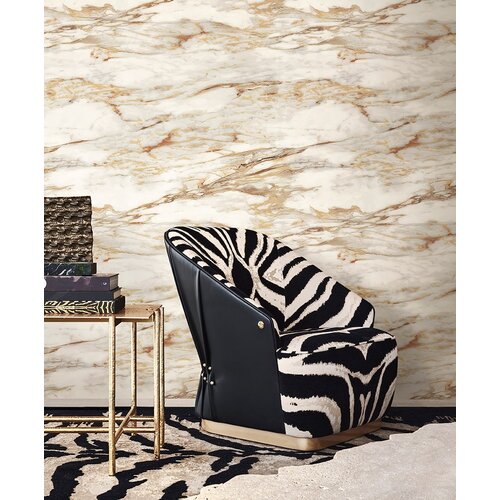 Een luxe marmerdessin met een horizontale aders in reliëf. Het breedte effect geeft het een groteske uitstraling. Goed gelijkend op een echte marmerplaat.