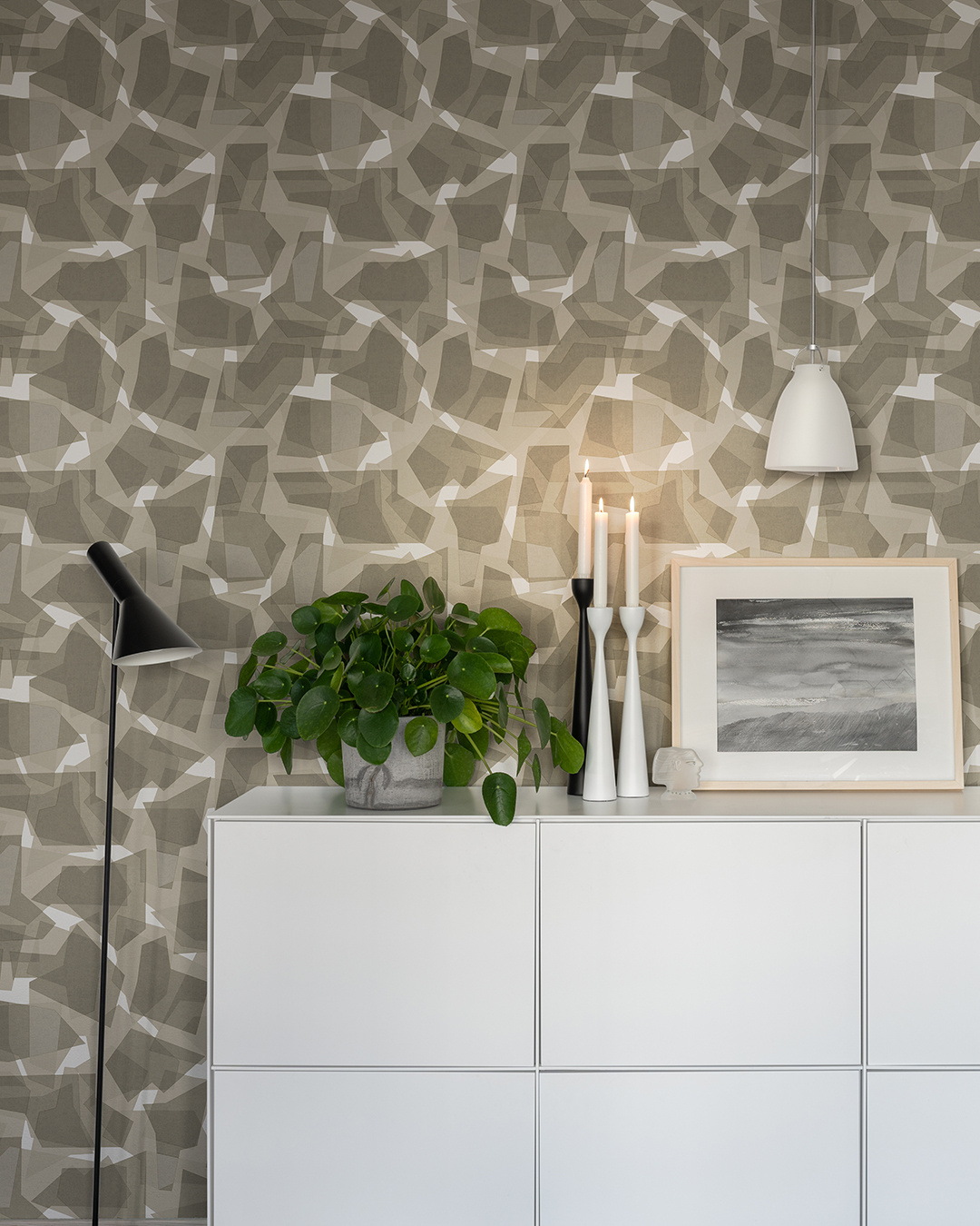Camo behang is modern maar elegant.Met dit warm grijze behang met een licht geometrisch camouflagepatroon dat een gezellige sfeer met een industriële uitstraling creëert. Verbind je met de natuur op een neutrale en moderne manier.