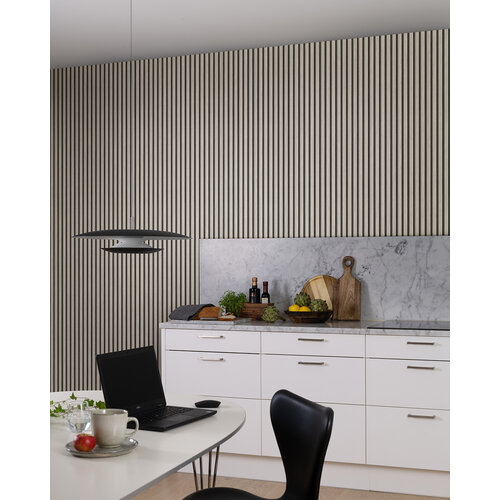 Ribbvägg is een prachtig houtbehang met licht gebeitste eikenhouten panelen verspreidt een verfrissend licht in de omgeving. Geef je huis een moderne uitstraling met dit behang als blikvanger. Geschikt oa als achtergrondmuur achter de bank of in de slaapkamer. De houten latten zijn 2,5 cm breed met een tussenruimte van 1,5 cm.