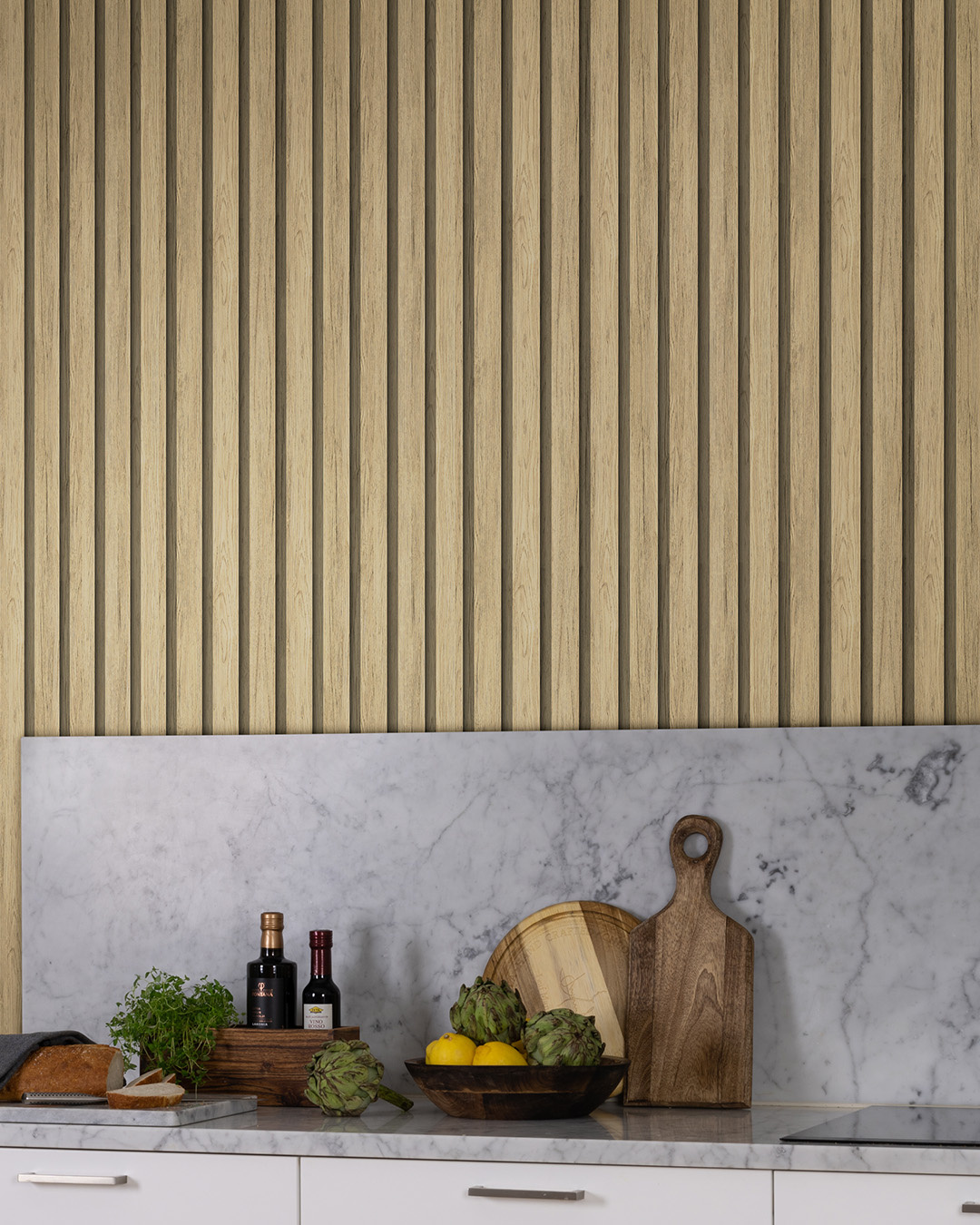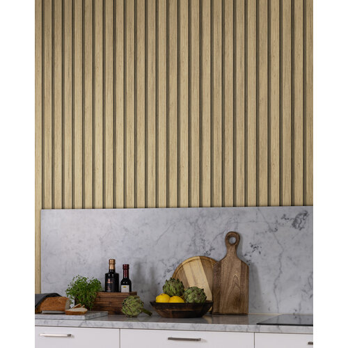 Het prachtige houten paneel Ribbvägg met bredere latten zorgt voor een huiselijke, gezellige sfeer.Breng in een handomdraai een frisse, natuurlijke uitstraling in huis met ons houten behang.Hier uitgevoerd in onbehandeld eikenhout dat warmte en een gevoel van geborgenheid toevoegt.De houten latten zijn 4,7 cm breed met een tussenruimte van 2 cm.