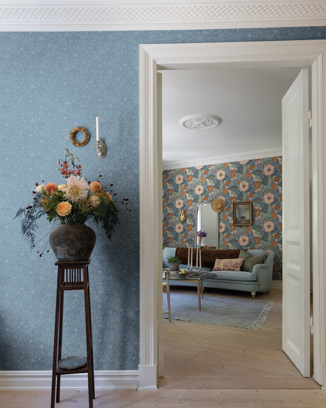Wilma brengt een kalme sfeer in de kamer die tot rust komt.Het behang is versierd met prachtige, gedetailleerde bloemen en bladeren, die diepte creëren.Wilma is verkrijgbaar in vijf unieke kleuren en is ontworpen door Hanna Wendelbo.