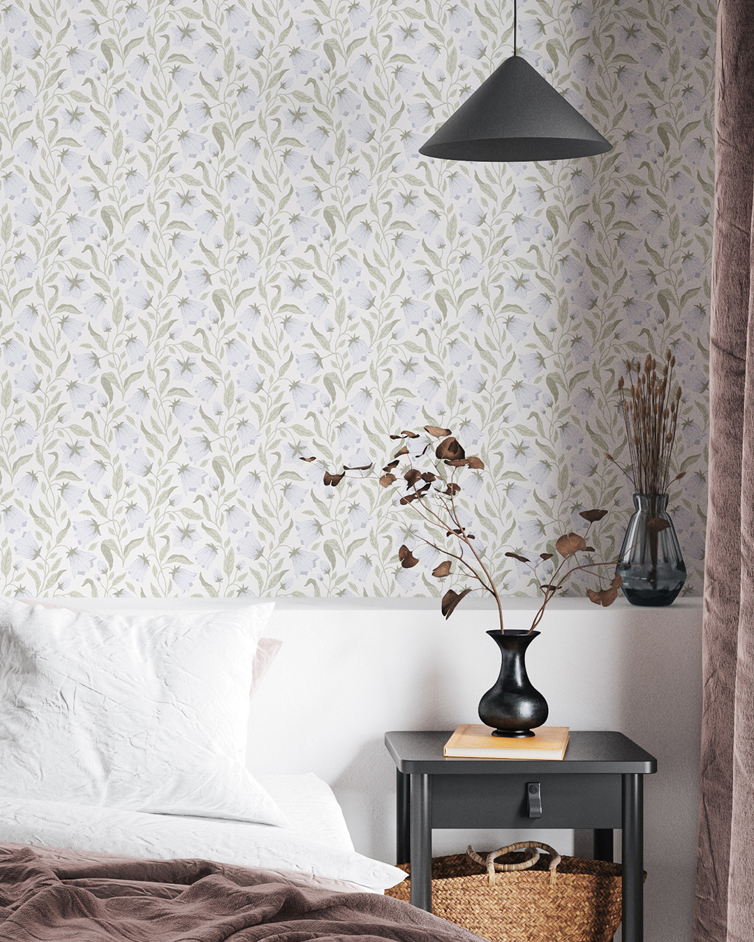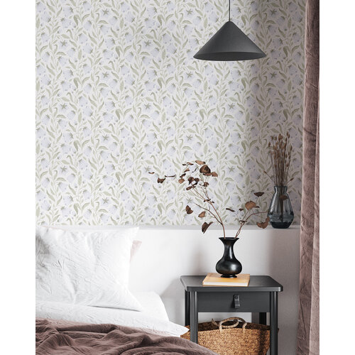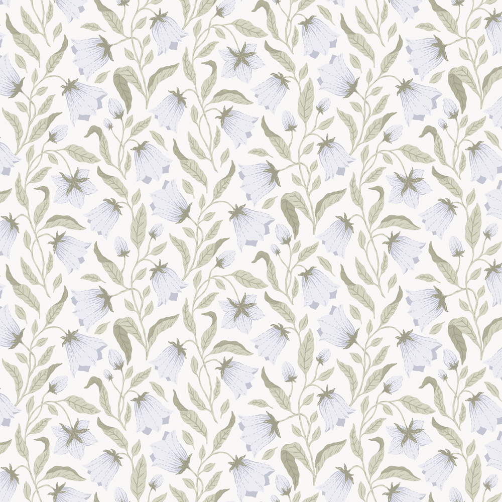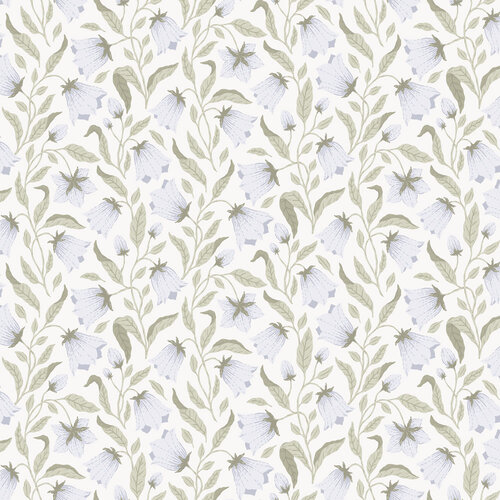 Stap een wereld vol blauwe klokjes binnen.Het behang "Blåklocka" (blauwe klokjes) heeft een elegant patroon dat zich subtiel langs de muur omhoog slingert en een harmonieuze sfeer creëert.