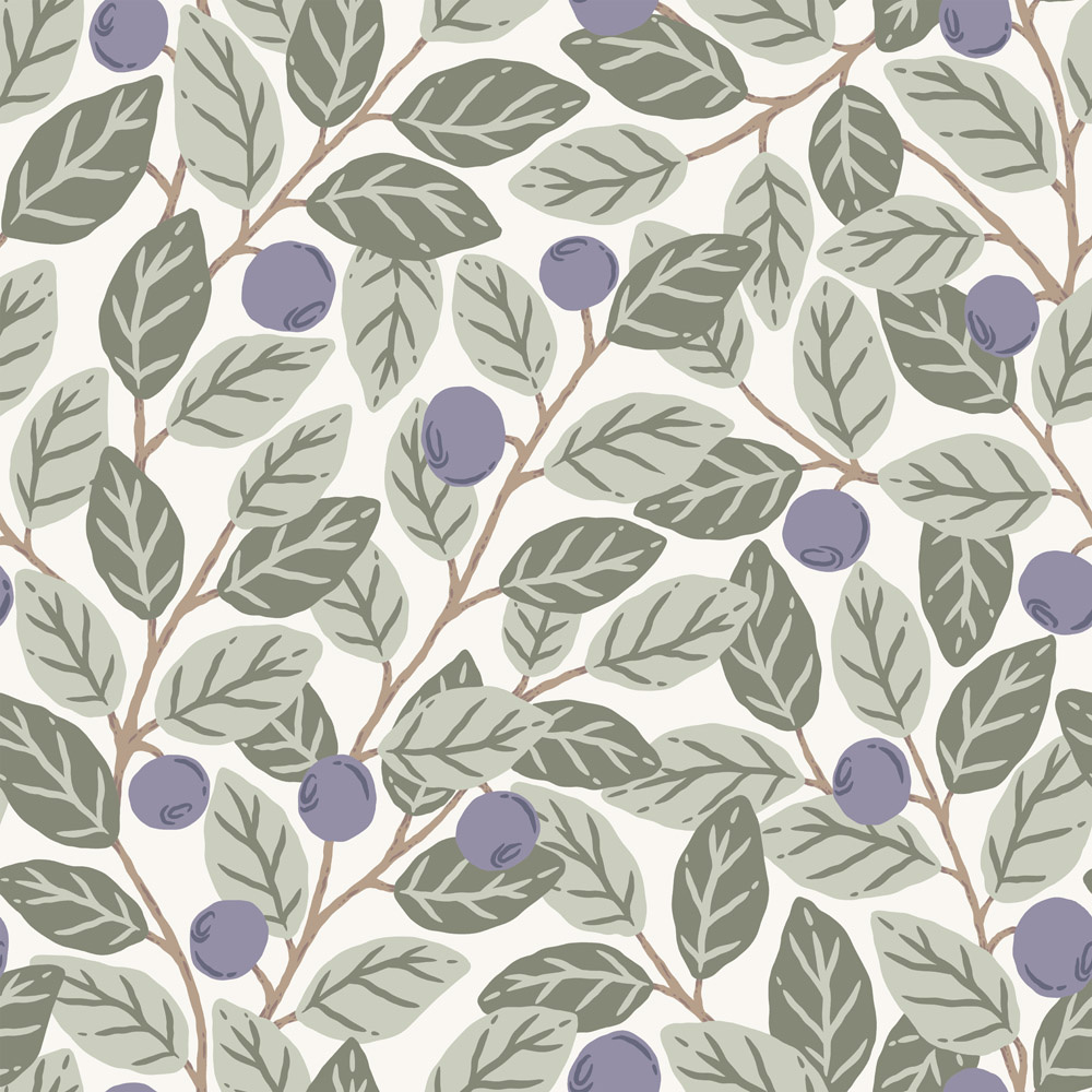 Stap Klara en Tove's bos van blauwe bessen binnen. Onderweg kom je takken tegen met grote groene bladeren, waarachter sappige blauwe bessen verscholen zitten. Het behang geeft een gezellige sfeer en creëert knusse momenten in de keuken, woonkamer of slaapkamer.