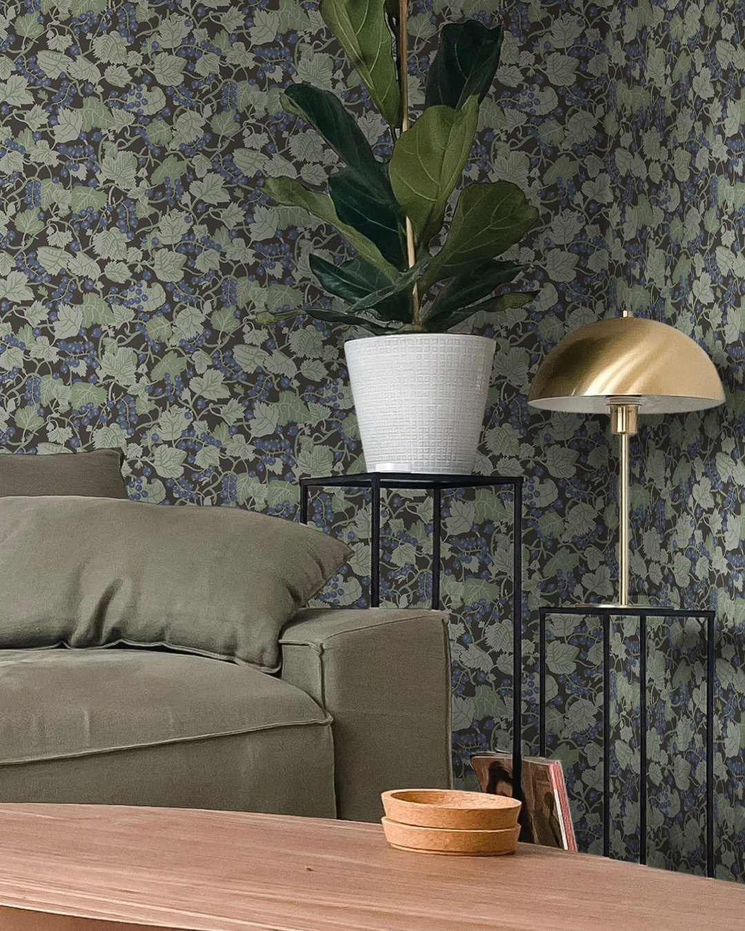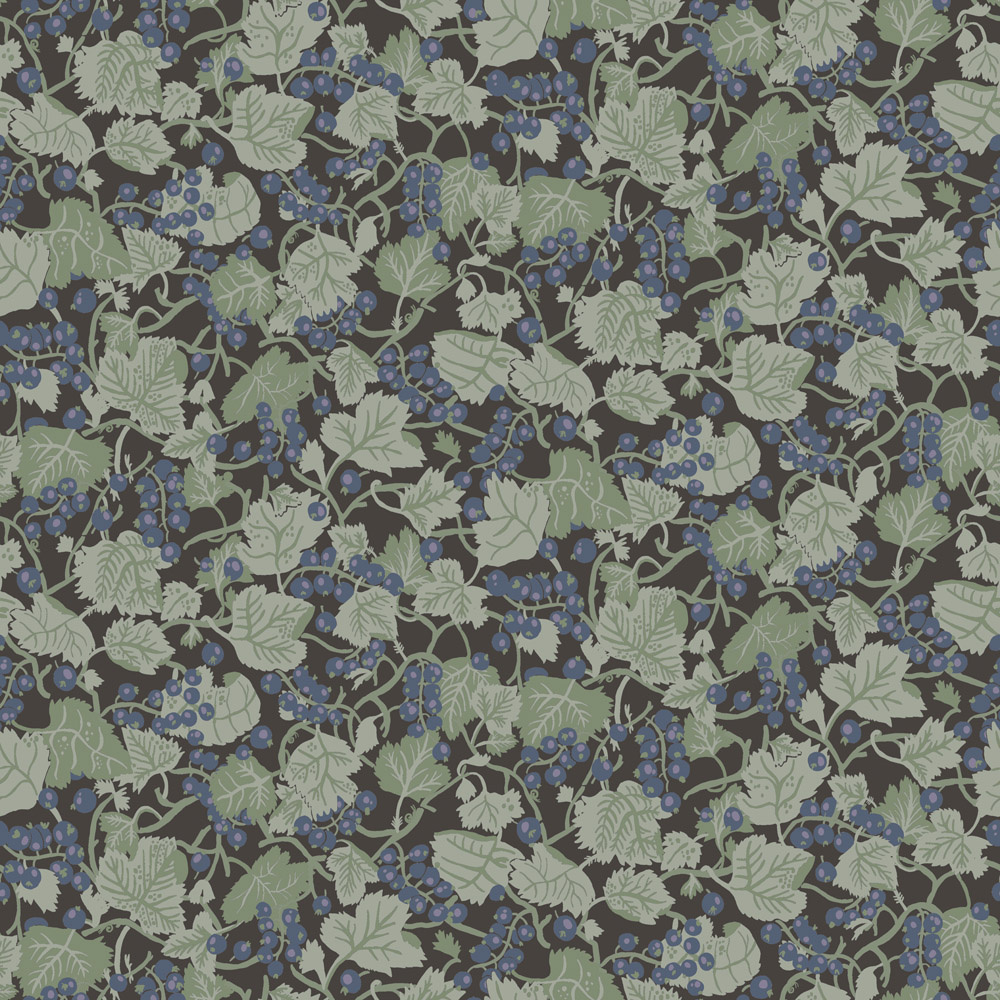 Laat wilde bessenstruiken vrijelijk bloeien aan de muren van het huis en in de tuin.De zure bessen, die op parels lijken, vormen een mooi contrast met het prachtige groene blad. Behang Vinbärsplock oftewel bessenoogst is verkrijgbaar in twee kleuren.
