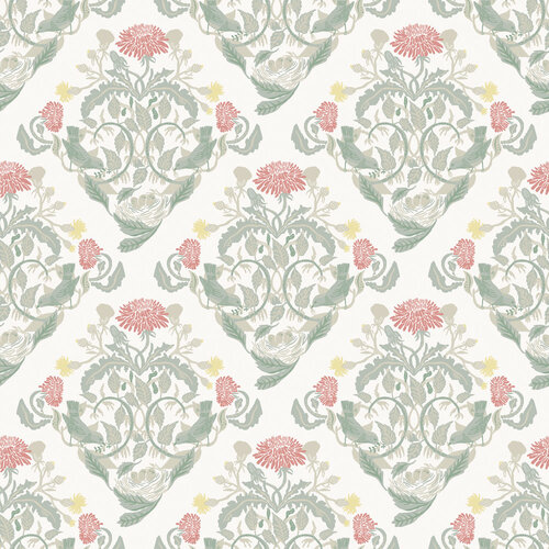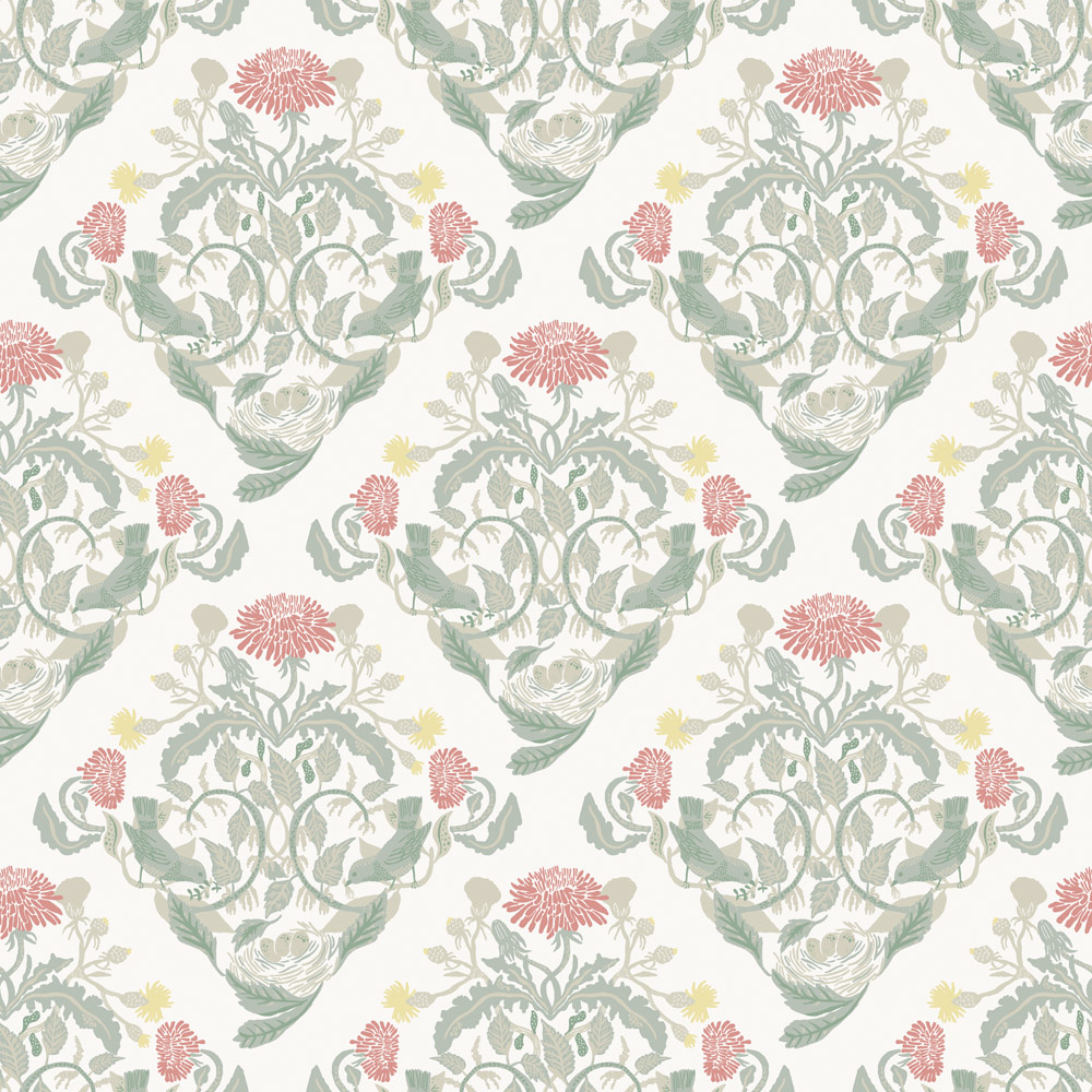 Het heldere medaillonbehang Frodas heeft een natuurlijk patroon met prachtige kleine details om te ontdekken.Paardenbloemen spreiden zich uit, brandnetels steken de hoogte in en te midden van doornige planten bevindt zich een vogelnest dat beschermd wordt door zijn omgeving.