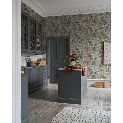 Het Anemone-behang met bladeren en grote, opvallende bloemen en klaprozen die een kalme en gezellige indruk geven en harmonie in huis creëren.Misschien krijgt dit favoriete patroon van Hanna Wendelbo wel een plekje in uw huis?