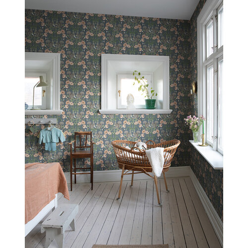 Het fantastische behang Kurre is opgebouwd als klassiek ornament maar dan opgebouwd uit bloemen, eikeltjes en eekhoorns. De hommels vliegen van klaproos naar klaproos en vullen de kamer met hun gezoem, een echt zomerliedje.