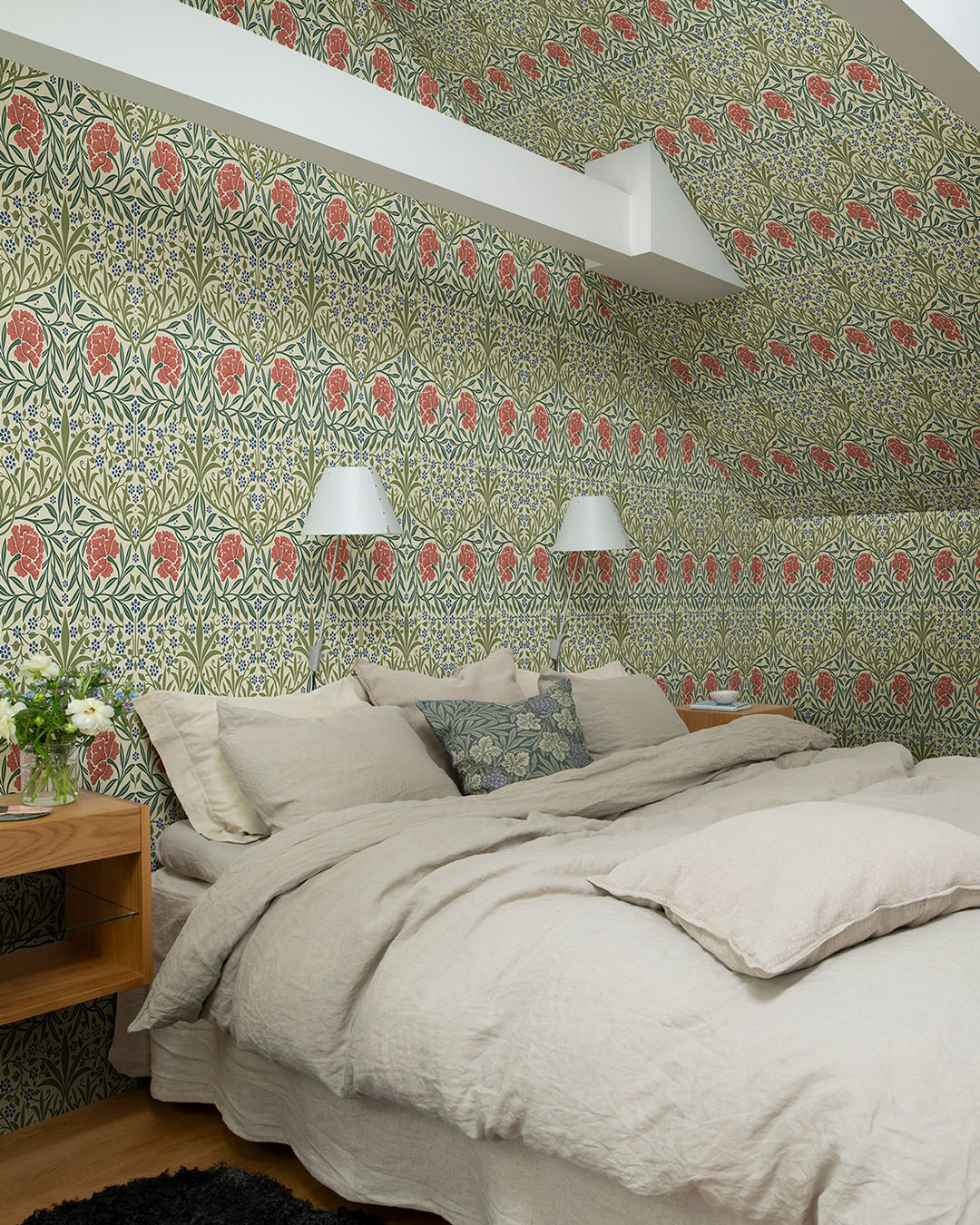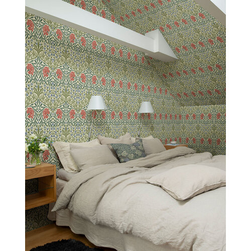 Dit patroon, ontworpen door William Morris zelf in 1876 voor de herinrichting van de debatzaal van de Oxford Union, is opvallend en toont wilgentakken en vergeet-me-nietjes die zowel van dichtbij als van veraf een indrukwekkende uitstraling hebben.