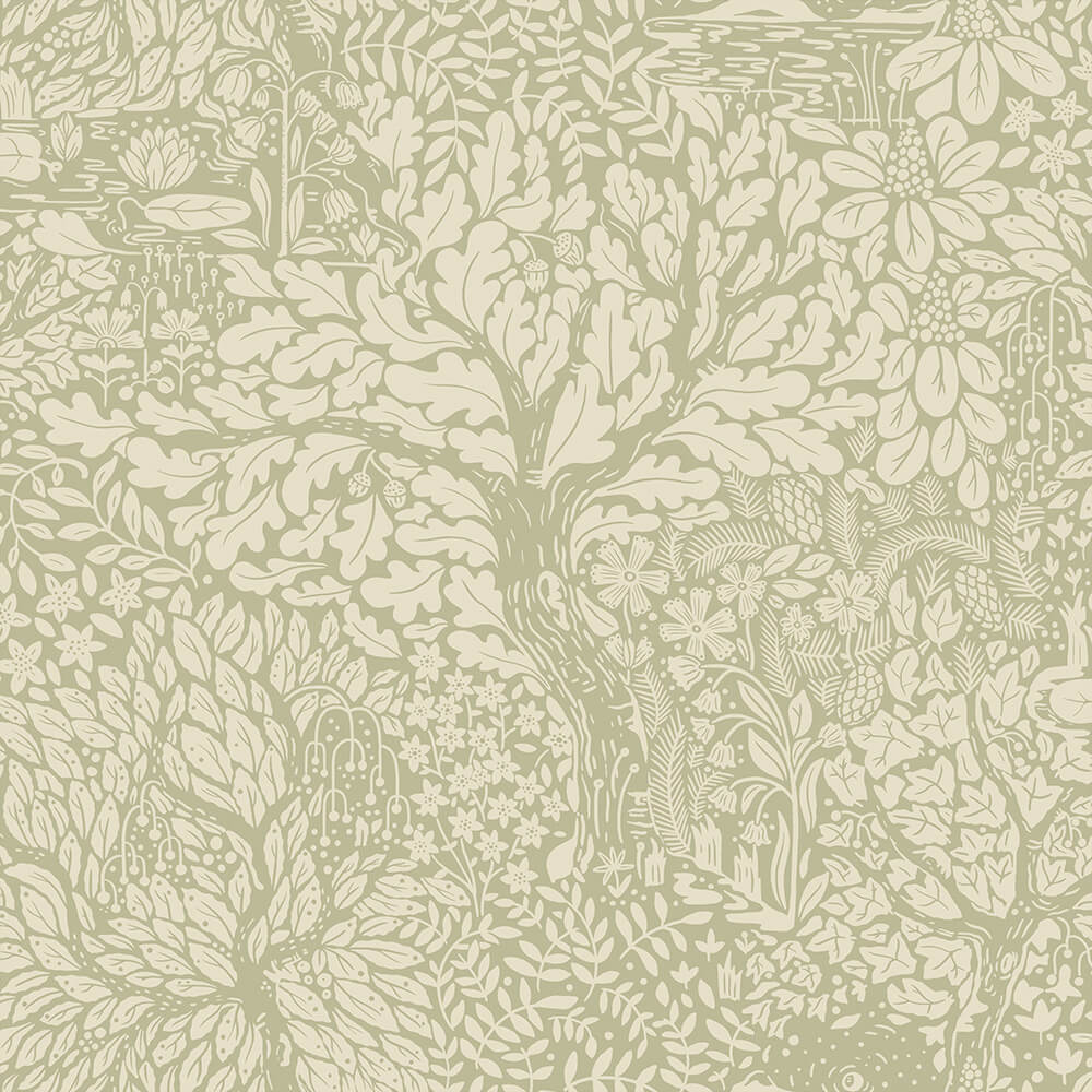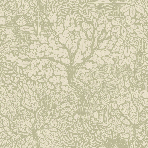 Het bosbehang Olle creëert een gevoel van verbondenheid met de natuur.Het prachtige patroon is geïnspireerd op het gevarieerde Zweedse boslandschap met zijn meren en vijvers.