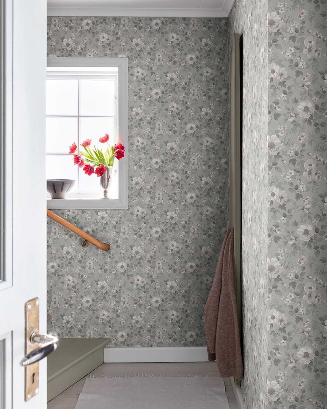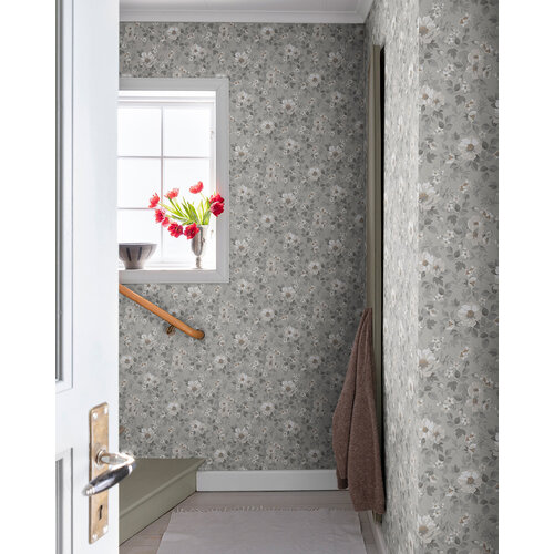 Het Johanna bloemenbehang heeft een ingetogen indruk, terwijl het patroon van prachtige rozenbottels de ruimte levendig maakt.