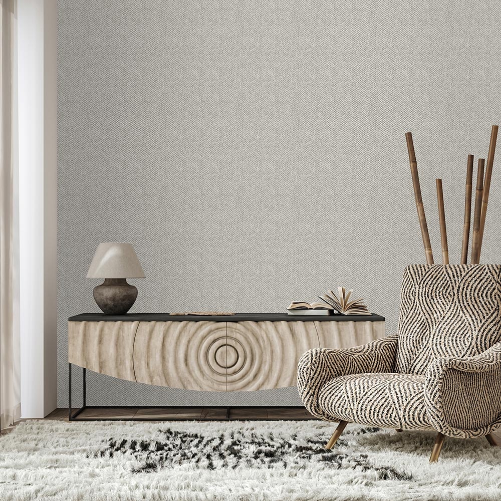 Het visgraatpatroon Herringbone is een gezellig behangontwerp met een subtiel dessin dat doet denken aan hoogwaardig, traditioneel geweven textiel.