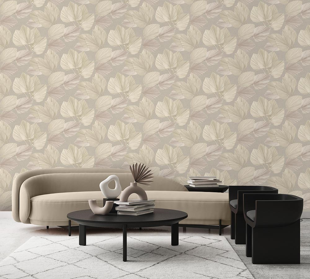 Het behangpatroon Palm legt de zonovergoten palmen tot in de kleinste details vast, met een achtergrond die op linnen lijkt. Dit opvallende ontwerp is perfect voor het creëren van een serene en uitnodigende sfeer.