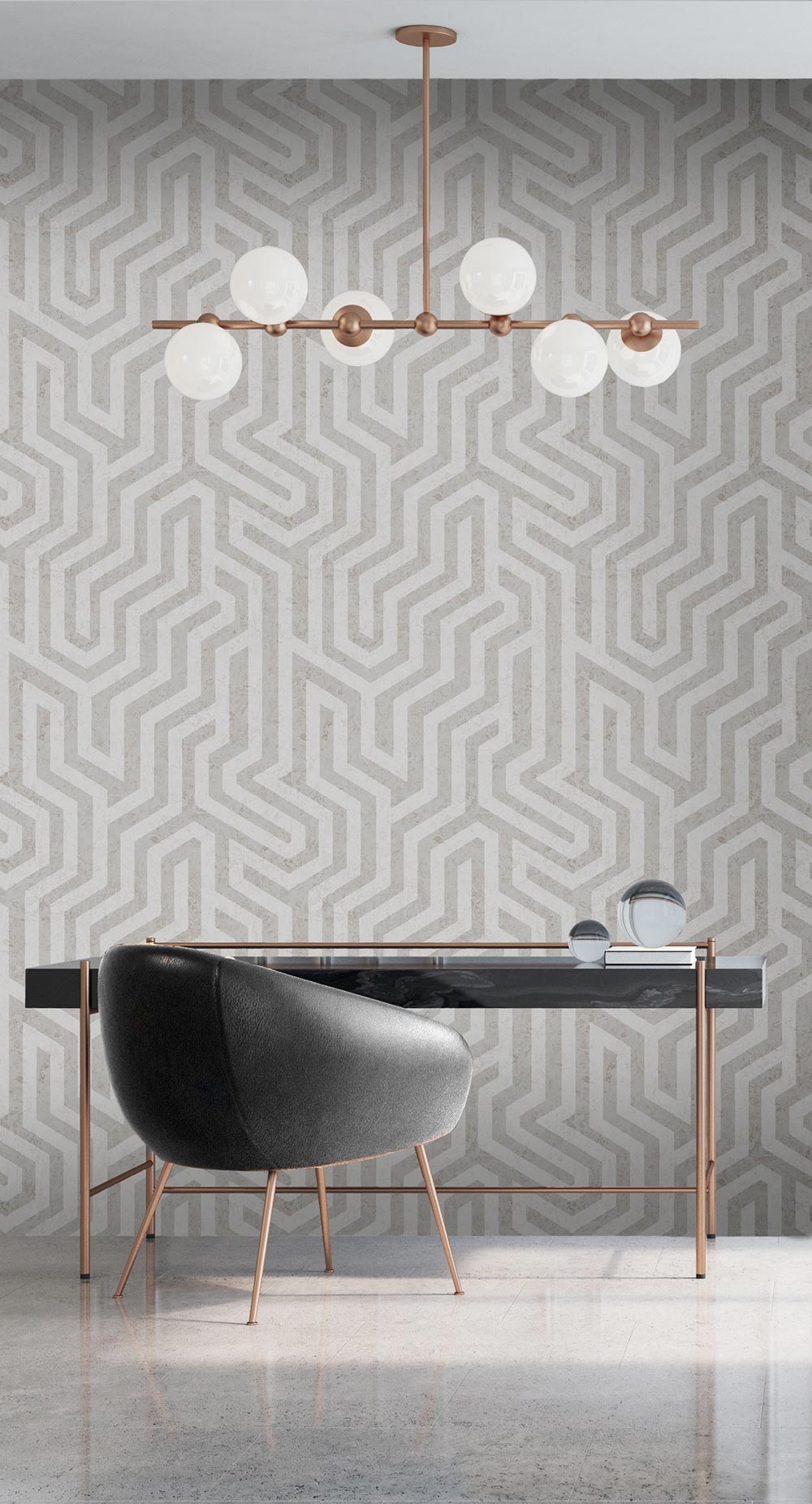 Riviera is een prachtig behang dat elke ruimte transformeert.Dit grafische behangontwerp heeft een groot labyrintpatroon, wat een opvallend visueel effect creëert dat de aandacht trekt en een verfijnde uitstraling geeft. Dit patroon, afgewerkt met een schitterende glasparelstructuur, vangt de essentie van klassieke luxe. Perfect voor wie zijn interieur een gevoel van diepte en elegantie wil geven.