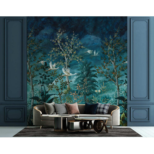 Deze adembenemende muurschildering toont een uitgestrekt gebied met torenhoge bomen, waarvan de silhouetten sierlijk afgetekend zijn tegen het diepe, inktblauwe van de nachtelijke hemel.Te midden van deze serene rust vliegen vogels door het maanverlichte landschap.Met ‘Midnight Canopy’ haalt u de schoonheid van de natuur en de magie van de nachtelijke hemel in huis en creëert u een ruimte die zowel betoverend als rustgevend is.