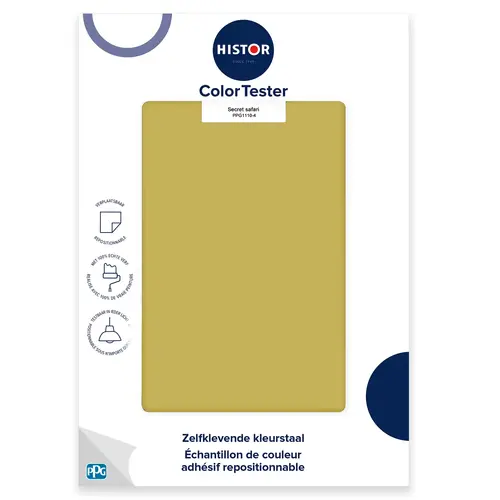 PPG ColorTester is een zelfklevende kleurstaal waarmee jij in één oogopslag kan zien of een kleur past op jouw muur. Deze kleurtester is makkelijk van de muur af te halen en te verplaatsen naar een andere plek. Zo test je de kleur op ieder moment en op meerdere plekken, totdat je zeker weet of Secret Safari bij jouw ruimte past.