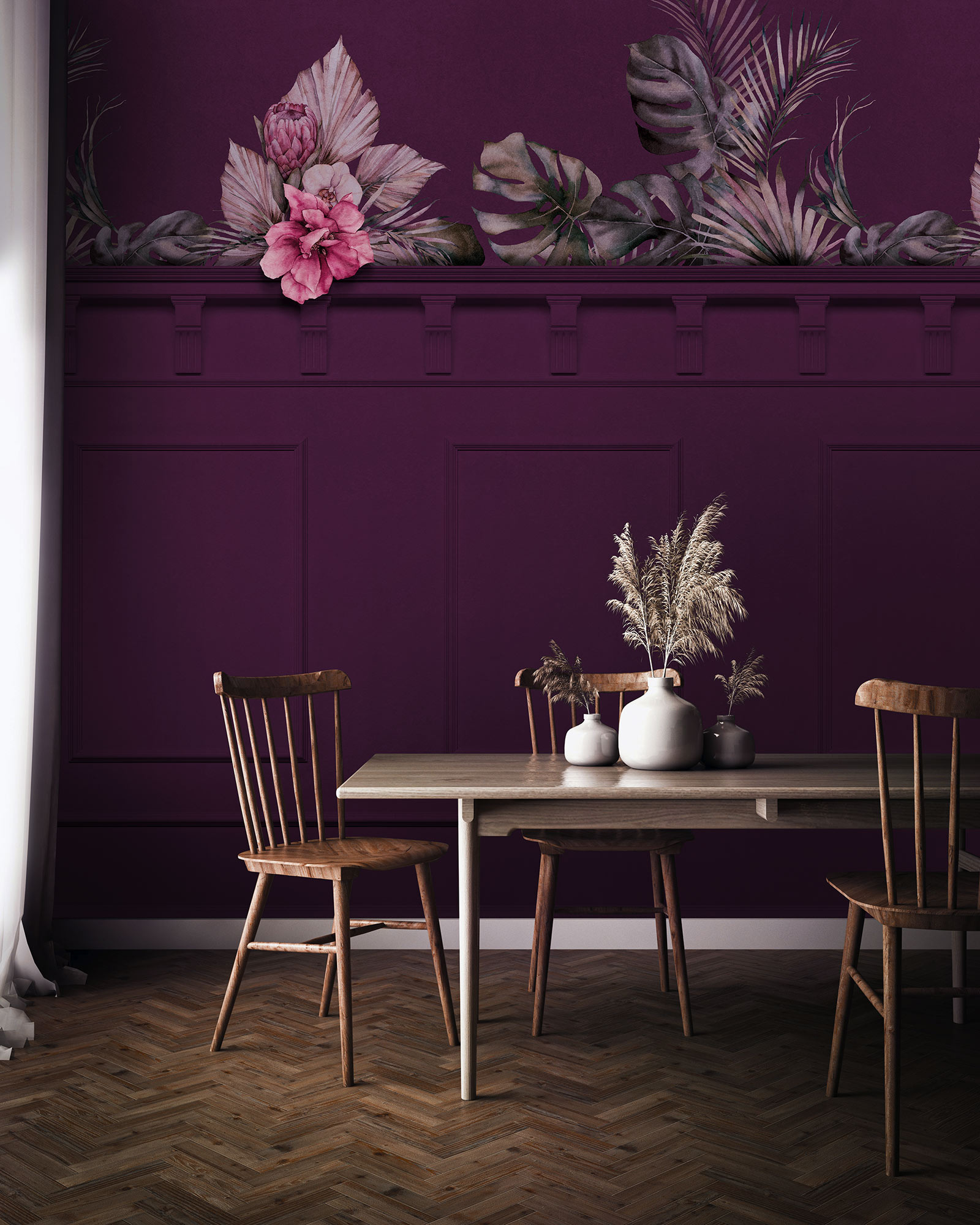 | Accentkleur | Diep roodpaars, plum, roze, vergrijsd groen |