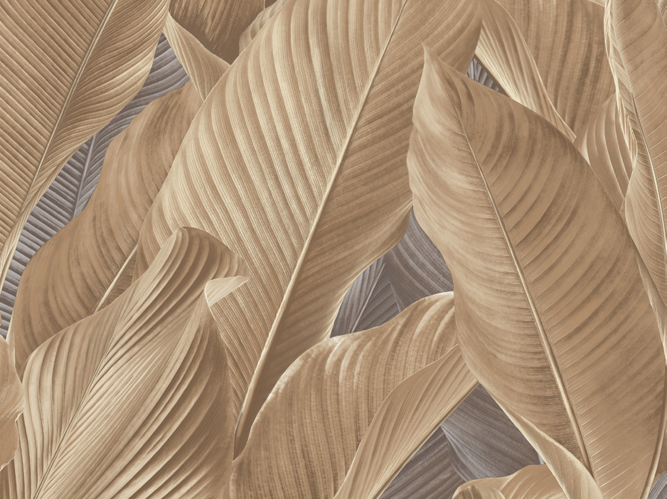 Met dit bladmotief Banya breng je rust, warmte en een vleugje tropische elegantie in je interieur. Dit dessin bestaat uit natuurgetrouwe grote overlappende bladeren met een voelbare structuur en een subtiele glansafwerking.