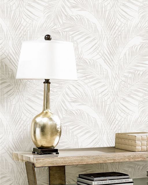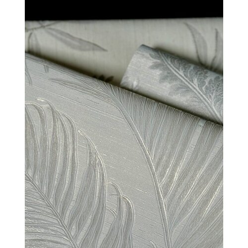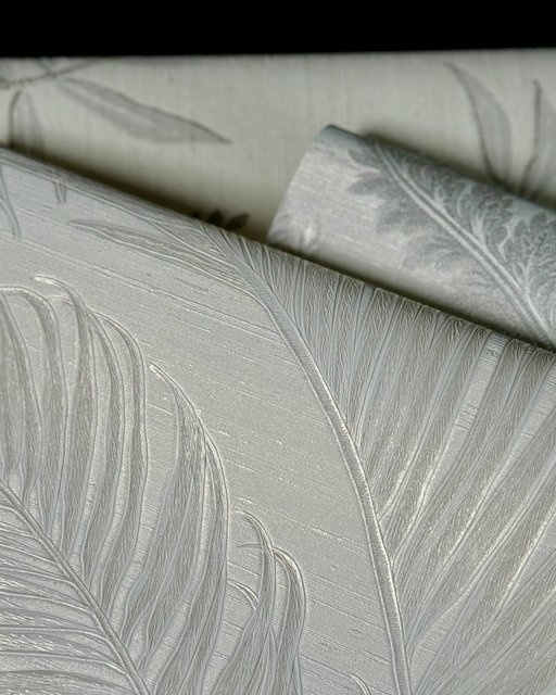 Een chique behang met een dessin van glanzende takken met fijne bladeren op een zijdenlook ondergrond.